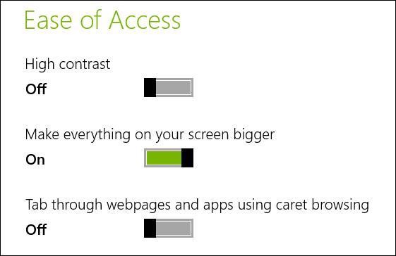 با باز شدن Metro Control Panel وارد قسمت Ease of Access شوید. اکنون از قسمت سمت راست صفحه، Make everything on your screen bigger را فعال نمایید.