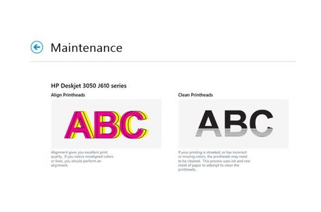 برای مثال در پرینترهای جوهرافشان HP صفحه شروعی برای کاربران ویندوز 8 وجود دارد که میتوان با کلیک بر روی دکمه Maintenance (تعمیر و نگهداری) هد پرینتر را تمیز کرد یا آن را تراز کرد. البته میتوانید هد پرینتر را تعویض کنید اما باید توجه داشته باشید که بعد از تعویض هد لازم است تا از کارتریج تازهای استفاده کنید.