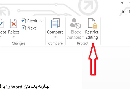 محافظت از یک فایل مستند به این معناست که کاربران قادر به دیدن متن بوده، ولی از امکان ایجاد تغییر در آن محروم خواهند بود. برای شروع بعد از باز کردن فایل مستند مورد نظر خود، روی روبان ابزار به تب Review بروید و بر Protect Document یا Restrict Editing ـ بسته به نسخه Word شما متفاوت است ـ کلیک کنید.