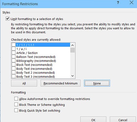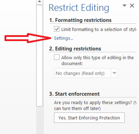در منو یا پنلی که در سمت راست باز می شود در پایین بخش Formatting Restrictions تیک گزینه: Limit formatting to a selection of styles را بزنید و بر دکمه Settings در زیر آن کلیک کنید.