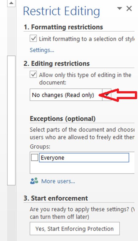 گام بعدی این است که به بخش Editing Restrictions برویم و در آنجا تیک گزینه Allow only this type of editing … را بزنید و از منوی پایین افتادنی زیر آن که فعال میشود، مطمئن شوید که گزینه No changes (read only) انتخاب شده باشد.